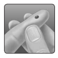 - Gently squeeze and/or massage your fingertip until a round drop of blood (● approximate size) forms on your fingertip.