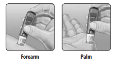 - Firmly press and hold the lancing device against your forearm or palm for a few seconds.
