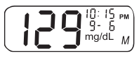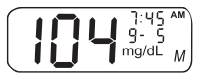 - If your meter is off, press and release ↓ to turn it on. After the start-up test screen, your most recent test result will appear on the display. “M” also appears to indicate memory mode.
